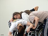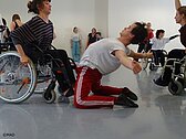 Die Künstler*innen mit und ohne Behinderung — Vera Rosner, Adil Embaby und Frans Poelstra — stellten ihre tanz-künstlerischen Methoden und Konzepte vor. Den Studierenden aus dem Institut für Tanz wurde in einer Lecture-Demonstration ein Überblick über die pädagogisch-künstlerische Arbeit geben, um danach performativ und experimentell für mehrere Stunden mit Rollstühlen eine tanz-künstlerische Intervention zu starten.