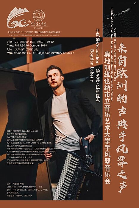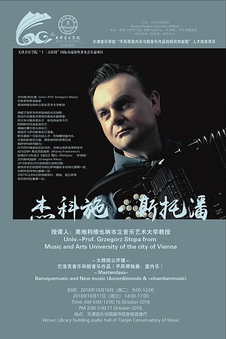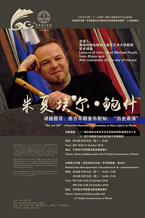 Michael Posch, Dekan der Fakultät Musik und Studiengangsleiter Alte Musik, Grzegorz Stopa, Professor für Akkordeon an der MUK und sein Student Bogdan Laketic wurden Mitte Oktober ans Tianjin Conservatory of Music eingeladen.
