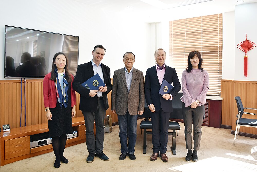 Zum Dank für die großartige Zusammenarbeit überreichte Michael Posch dem Rektor des Tianjin Conservatory of Music einen persönlichen Brief von MUK-Rektor Andreas Mailath-Pokorny. Michael Posch und Grzegorz Stopa wurde wiederum eine Gastprofessur des chinesischen Konservatoriums verliehen.