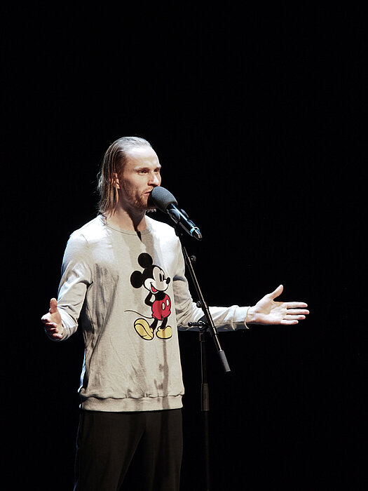 Die jungen KünstlerInnen präsentierten ihre ausgezeichneten Performances, moderiert von Steffi Krautz (Schauspielerin und MUK-Lehrende) im Theater Akzent. In diesem Jahr wurde zusätzlich erstmals ein Publikumspreis in der Höhe von € 1.500,— vergeben, der an den Beitrag Sentilo verliehen wurde.