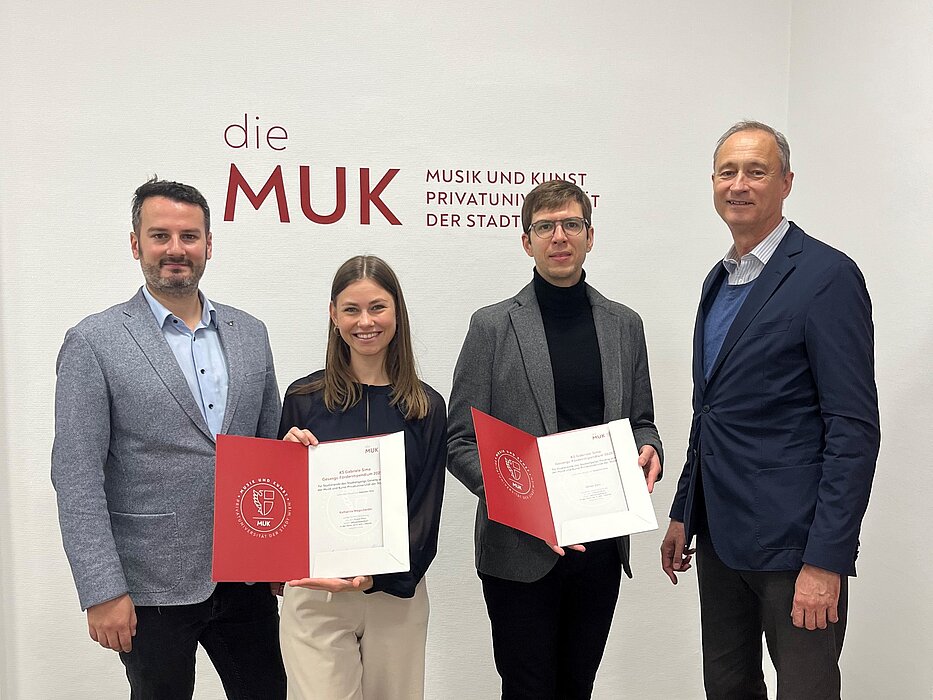 Katharina Wegscheider absolviert aktuell ihr Masterstudium Sologesang in der Klasse von Uta Schwabe: Sie darf sich über den Ersten Preis und somit über ein Stipendium in der Höhe von € 500,— pro Monat freuen. Der Zweite Preis, ein Stipendium in der Höhe von € 300,— pro Monat, geht in diesem Jahr an Oliver Zinn, der im ebenfalls im Master Sologesang bei Uta Schwabe sowie Lied und Oratorium bei Birgid Steinberger studiert. Beide Stipendien sind bereits mit 1. September 2025 gestartet und haben eine Laufzeit von 12 Monaten.