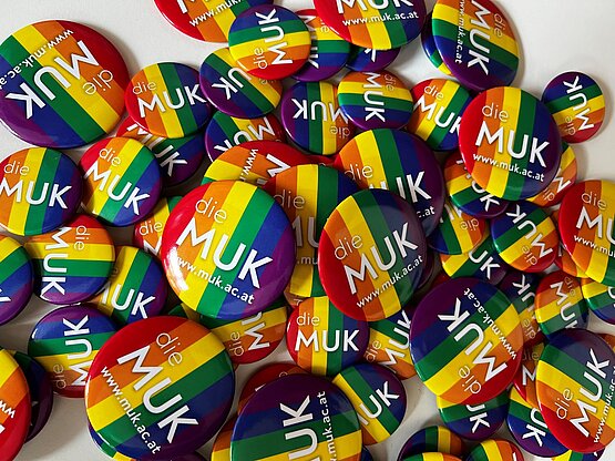 Aus diesem Anlass haben wir Badges und Magneten aufgelegt: Wer sich bis 18. Juni unter der E-Mail-Adresse gewinnspiel@muk.ac.at meldet, erhält die Regenbogen-Goodies ein wenig später beim Empfang.