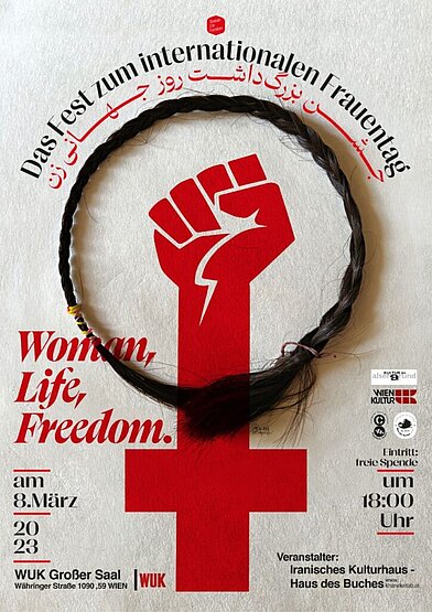 In diesem Jahr steht der Frauentag im WUK unter dem Motto „Zihen Ziyan Azadi“, auf Deutsch „Frau, Leben, Freiheit“ und auf Farsi „Zan Zendegi Azadi“! — in Solidarität mit den iranischen Frauen und ganz besonders mit der neuen Generation. Die jüngste Iranische Revolution hat das Potenzial, Weltgeschichte zu schreiben. Nur durch die Befreiung der Frauen von der jahrzehntelangen Unterdrückung kann die gesamte Gesellschaft befreit werden.