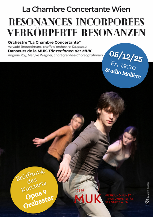 Die Studierenden des 2. Jahrgangs Zeitgenössischer und Klassischer Tanz der MUK werden am Fr, 5. Dezember, 19:30 Uhr im Studio Molière im Rahmen des Kooperationskonzerts „Verkörperte Resonanzen“ mit dem Orchester „La Chambre Concertante“ auf der Bühne stehen. Zur Aufführung gelangt Schuberts 5. Sinfonie.