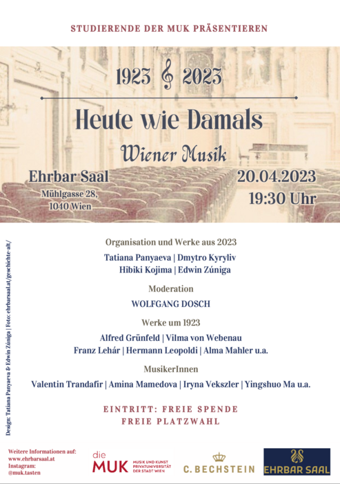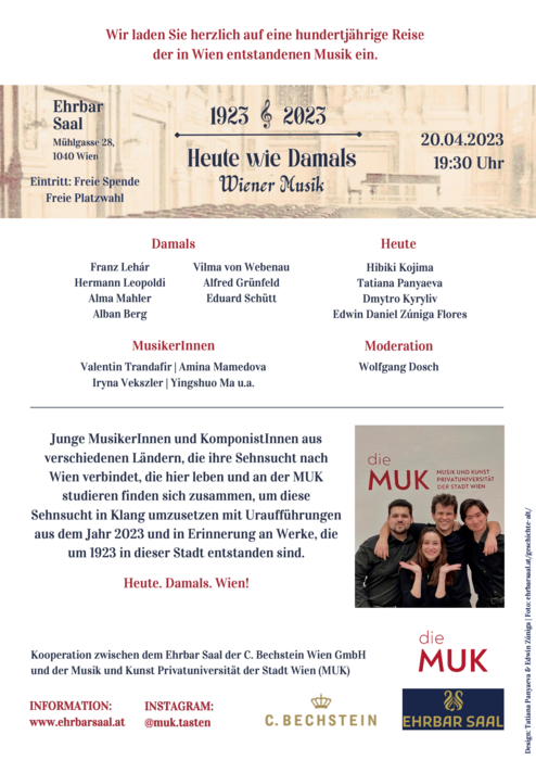 Die vier jungen Komponist*innen der MUK übernehmen dabei auch die musikalische Leitung. Präsentiert werden bei Heute wie Damals — Wiener Musik von Werke von Franz Lehár, Alma Mahler, Alban Berg, Vilma von Webenau, Hermann Leopoldi, Alfred Grünfeld sowie Uraufführungen von Werken aus dem Jahr 2023. Durch das Programm dieser neuen Kooperation zwischen Ehrbar-Saal und dem Studiengang Tasteninstrumente, Musikleitung und Komposition der MUK (Studiengangsleitung: Jean Beers) führt der MUK-Lehrende Wolfgang Dosch. Interpretationen von Valentin Trandafir, Amina Mamedova, Iryna Vekszler, Yingshuo Ma, u. a. ergänzen die abwechslungsreiche Aufführung.