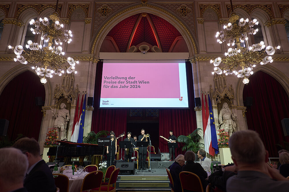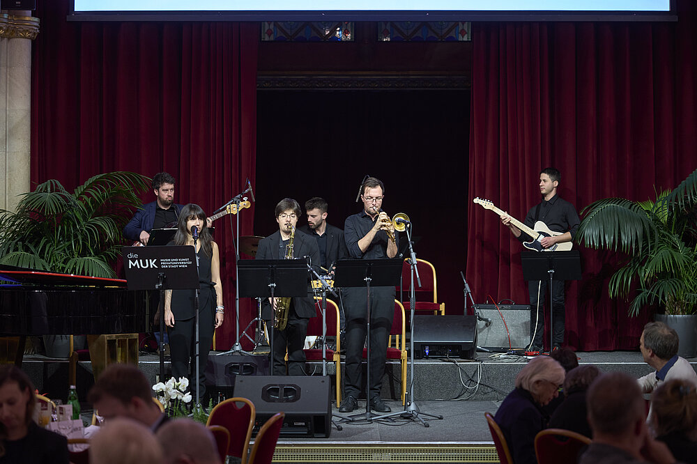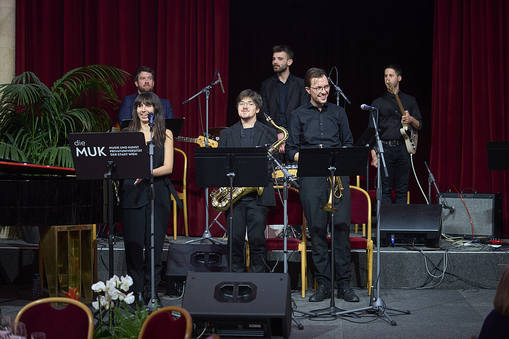 Für die musikalische Begleitung der Preisverleihung sorgten in diesem Jahr Studierende der MUK: Auf der Bühne standen Pianist Akihiro Sano (Klasse Johannes Kropfitsch und Ralf Heiber) sowie Peter Roms Contemporary Grooves Ensemble, bestehend aus Georg Buxhofer (Bass), Bogdan Đurđević (Drums), Mark Varga (Guitar), Valentin Edelmann (Piano), Daniel Kluckner (Sax), Jordi Roviró (Trumpet) und Dila Gödekli (Vocals).