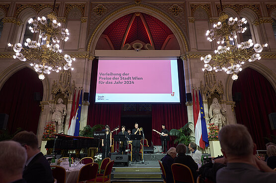 Pianist Akihiro Sano aus dem Institut Tasteninstrumente und das Contemporary Grooves Ensemble aus dem Institut Jazz sorgten vergangenen Mittwoch für die Musik bei der Verleihung der Preise der Stadt Wien im Wiener Rathaus.