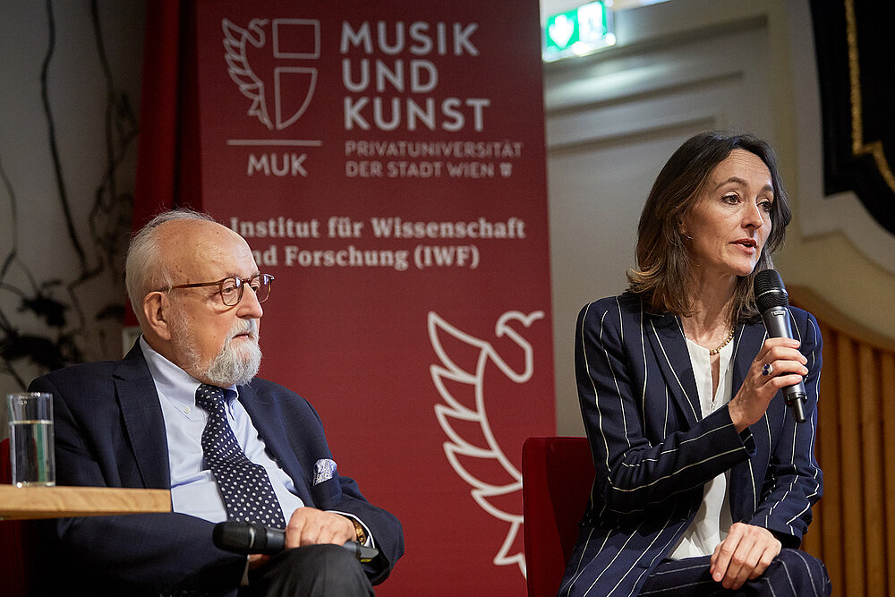 Während die Nachmittage des 27. und 28. März der Meisterklasse gewidmet waren, galten die Vormittage des 28. und 29. März der wissenschaftlichen Auseinandersetzung mit dem Werk Pendereckis. Die Vorträge von Daniel Elphick (Royal Holloway and Goldsmiths, London), Roman Berchenko (Radio Orpheus, State Institute of Arts Studies, Moskau), Aleksander Laskowski (Adam Mickiewicz Institute, Warschau) und Susana Zapke (IWF, MUK) behandelten sowohl Aspekte der Rezeptionsgeschichte als auch der musikalischen Ästhetik und Analyse von Pendereckis frühen kammermusikalischen Werken. Das Symposium endete mit einer Podiumsdiskussion mit Krzysztof Penderecki, die für einen sehr lebendigen Austausch mit Studierenden und Lehrenden der MUK sorgte.