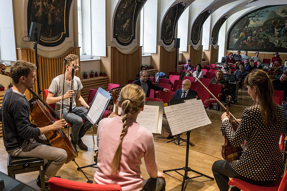 Die Studierenden hatten im Rahmen der Masterklasse die Gelegenheit, sich mit dem frühen kammermusikalischen Werk von Penderecki zu befassen und sowohl interpretatorische als auch werkimmanente Fragen direkt an den Komponisten zu richten. Die Kammermusik, jene Gattung, bei der man – wie Penderecki selbst betonte „die eigentliche Größe eines Komponisten“ bemessen kann, stand im Mittelpunkt der Masterklassen und des Konzerts im Gläsernen Saal des Wiener Musikvereins. Das musikalisch anspruchsvolle, technisch herausfordernde Programmrepertoire bestand aus den Streichquartetten Nr. 1 von 1960 und Nr. 2 von 1968, dem Quartett für Klarinette und Streichtrio Nr. 1 von 1993 sowie als Höhepunkt dem Sextett für Klarinette, Horn, Violine, Viola, Violoncello und Klavier, einem Auftragswerk der Gesellschaft der Musikfreunde, das im Jahr 2000 im Musikverein uraufgeführt wurde.