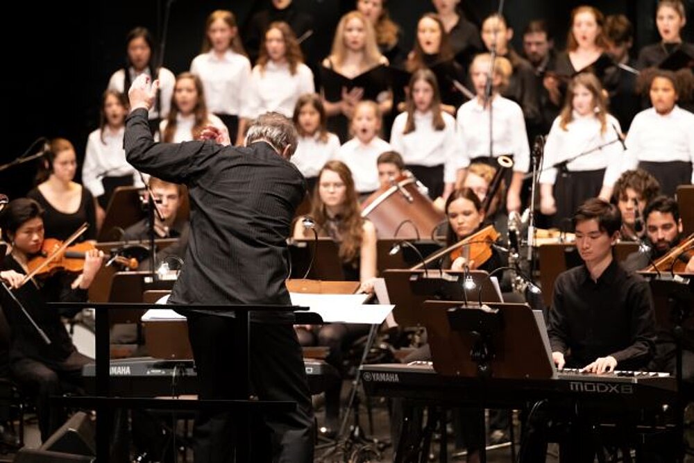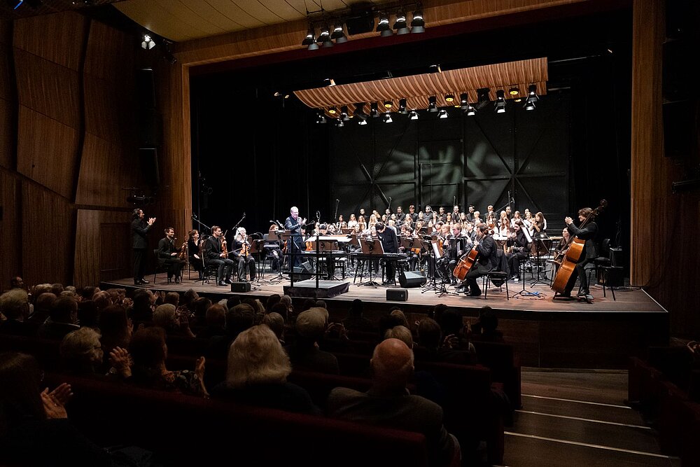 Zum 25-jährigen Bestehen des Mauthausen Komitees Österreich (MKÖ) haben die jungen Musiker*innen des MUK.sinfonieorchesters Joe Zawinuls "Mauthausen … vom großen Sterben hören" in einer neu ausgearbeiteten Orchesterfassung im MuTh auf die Bühne gebracht.
