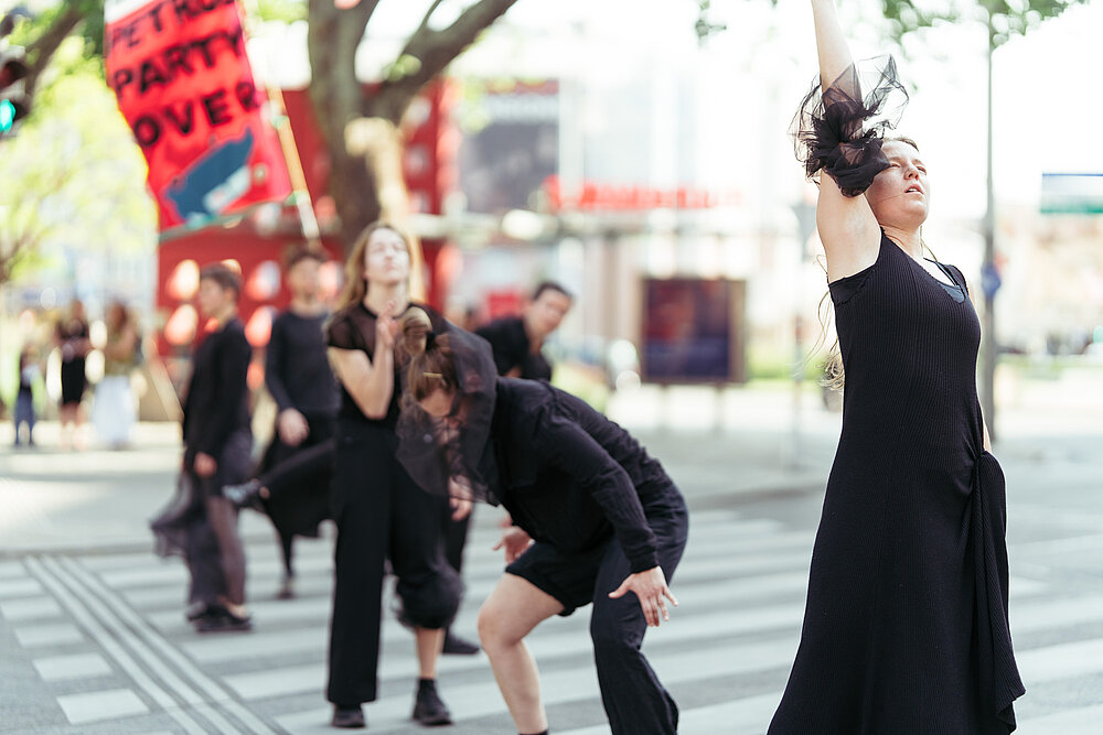 Am Zebrastreifen einer stark befahrenen Wiener Innenstadtstraße setzen tänzerisch-performative Bewegungsabläufe ein sichtbares Zeichen für die Dringlichkeit der Mobilitätswende.