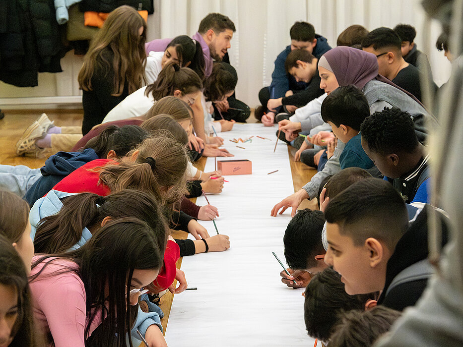 Bei der abschließenden Präsentation stellten alle vier Gruppen ihre Ergebnisse vor. Die künstlerischen Beiträge reichten von performativen Formaten über visuelle Arbeiten bis hin zu interaktiven Elementen und zeigten eindrucksvoll, wie intensiv sich die Jugendlichen innerhalb kurzer Zeit mit komplexen Themen auseinandergesetzt hatten. Besonders beeindruckend war, dass viele der Schüler*innen zuvor nur wenig Erfahrung mit künstlerischen Arbeitsweisen hatten.