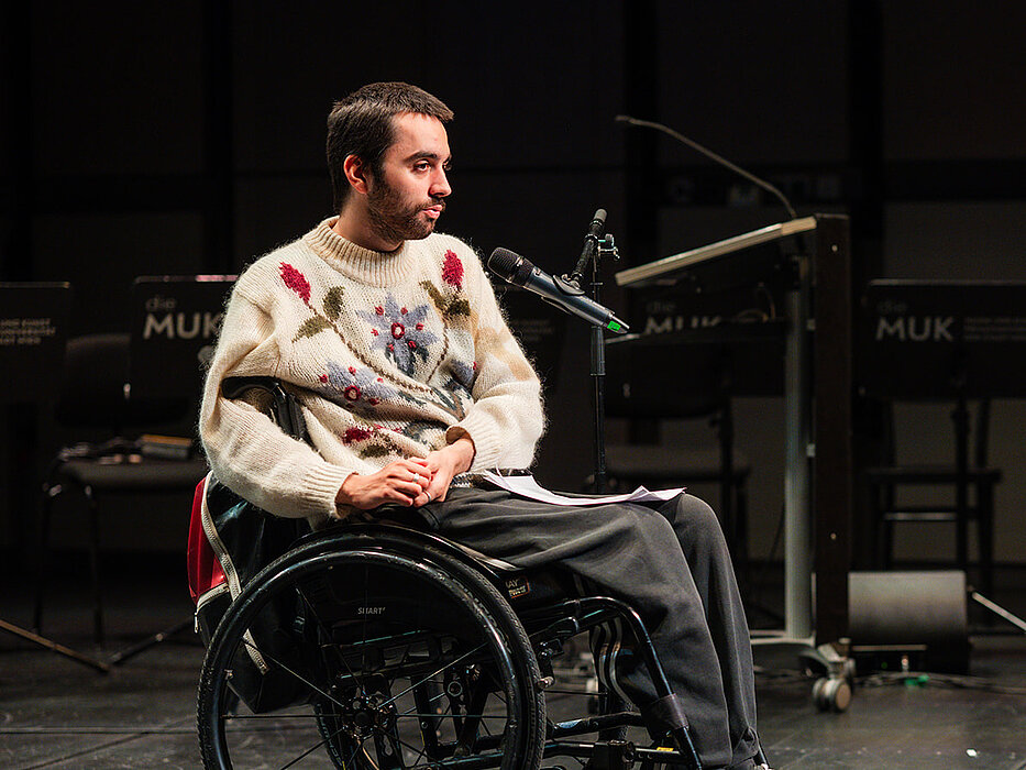 Anschließend thematisierten drei junge Künstler*innen in Erfahrungsberichten sehr konkret, mit welchen Barrieren sie selbst im Zuge von Aufnahmeprüfungen, beim Studium und in der künstlerischen Praxis konfrontiert worden sind. Sie alle — der Posaunist Martin Ortner (mdw) sowie die Schauspielstudierenden Felix Hiebl und Elisa Perlick (MUK) — berichteten von mentalen Barrieren aufseiten von Lehrenden und Kommissionsmitgliedern, aber auch von deren gemeinsamer Überwindung. Die lösungsorientierte Selbstkompetenz von Menschen mit Behinderung sei ernstzunehmen (Martin Ortner), andere Blickwinkel und Voraussetzungen mitzudenken (Felix Hiebl) und vermeintlich selbstverständliche Normen seien zu hinterfragen (Elisa Perlick). Letzteres sei im Rahmen von mixed abled-Gruppenarbeit im Studium sehr gut möglich.