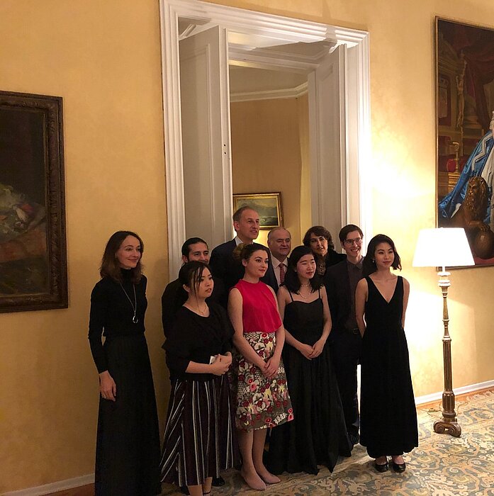 Beim Abschlusskonzert in der Spanischen Botschaft, das Rosa Torres Pardo persönlich mit einem Stück aus Isaac Albéniz‛ Iberia-Suite eröffnete, präsentierten sich die Studierenden der MUK in überzeugenden Interpretationen mit weiteren Werken von Albéniz sowie Enrique Granados, Manuel de Falla und Alberto Ginastera.