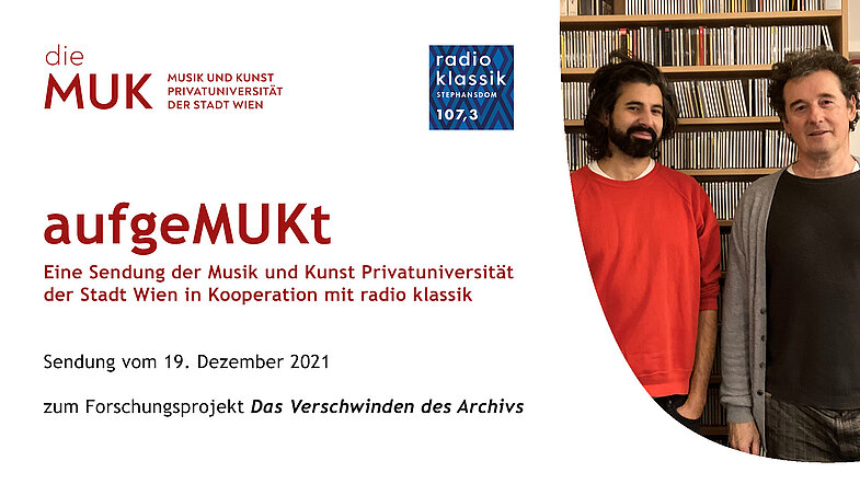 Zu Gast in dieser Sendung sind Fred Büchel und Alexander Mairhofer von der Agentur für Unabkömmlichkeitsbegründungen (AGFU). Sie arbeiten gemeinsam mit Rosemarie Brucher (MUK), Roland Innerhofer (Uni Wien) und Lukas Schmutzer (AGFU) am künstlerischen Forschungsprojekt Das Verschwinden des Archivs zusammen. Das vom FWF finanzierte Projekt ist an der MUK und der Universität Wien verankert.