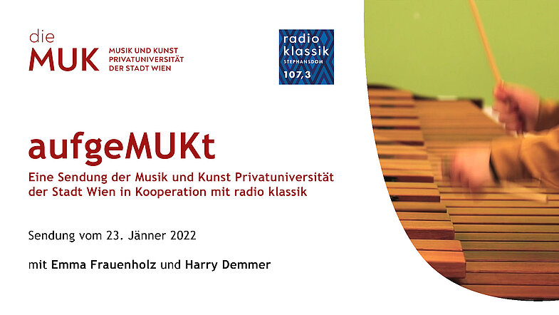 In dieser Sendung stehen der Studiengang Schlagwerk und das Projekt Against all odds im Mittelpunkt. Als Gäste im Radio Klassik-Studio begrüßt Marion Eigl Harry Demmer, der seit 1991 an der MUK unterrichtet sowie Emma Frauenholz, derzeit im dritten Semester ihres Bachelorstudiums Schlagwerk.