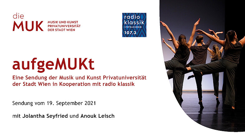 Zu Gast bei Marion Eigl im Studio für die September-Ausgabe sind Jolantha Seyfried, Lehrende im Studiengang Tanz sowie Anouk Leisch, derzeit im 5. Vorbereitungslehrgang Tanz an der MUK. Parallel zu ihrer Tanzausbildung besucht Anouk das BRG III Boerhaavegasse in Wien. Die beiden Studiogäste erzählen wie Schul- und Tanzausbildung „unter einen Hut“ gebracht werden kann.