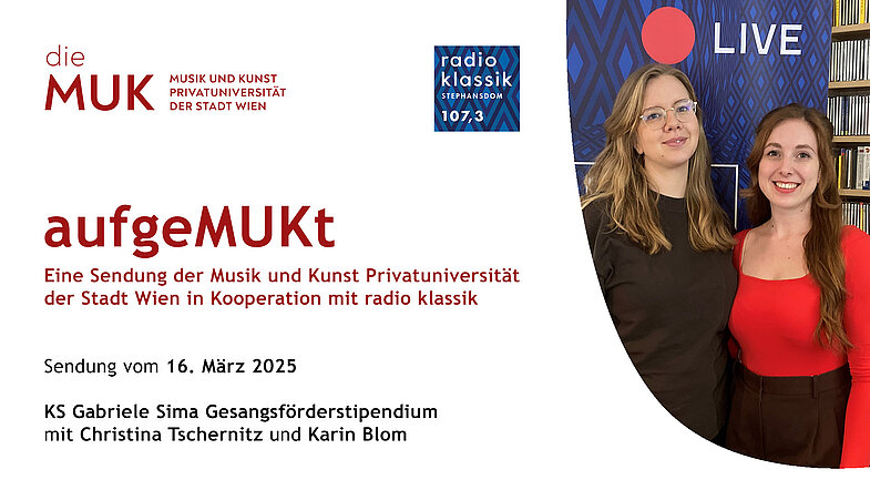 Christina Tschernitz und Karin Blom studieren beide im Masterstudium Sologesang an der MUK. Beim Vorsingen für das KS Gabriele Sima Gesangsförderstipendium konnten die beiden Sopranistinnen die renommierte Jury von sich überzeugen und dürfen sich über ein einjähriges Stipendium freuen. Marion Eigl hat mit den beiden Studentinnen über bisherige Erfahrungen, mittelfristige Ziele und die jeweiligen Wege von Kärnten beziehungsweise Schweden nach Wien gesprochen.