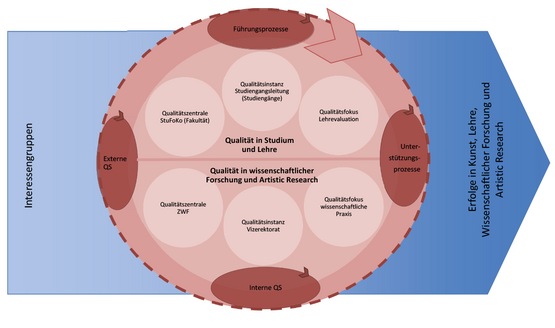 Die beiden Kernprozesse, Qualität in Studium und Lehre und Qualität in wissenschaftlicher Forschung und Artistic Research, sind die zentralen Bereiche der Qualitätssicherung der Privatuniversität, die auf drei unterschiedlichen Ebenen unter Einbeziehung des Studiendirektors und des Senats wirken.