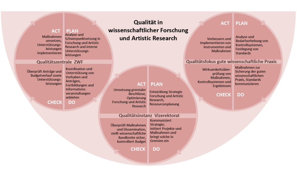 Ein strukturelles Mehraugenprinzip gewährleistet intern die Qualitätssicherung durch die Verankerung des Zentrums für Wissenschaft und Forschung (ZWF) sowie durch die Einrichtung der Forschungsservices im Rektorat. Forschungsagenden werden sowohl im regelmäßigen Jour fixe des Zentrums für Wissenschaft und Forschung besprochen als auch unter Einbezug der Dekan*innen im Jour fixe des Rektorats thematisiert.
