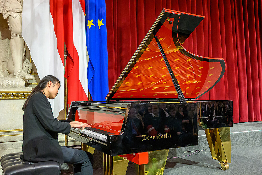 Die Festreden von Vizerektorin PD Ass.Prof.in Dr.in Rosemarie Brucher und Vizerektor Dieter Boyer, MA MAS wurden von musikalischen Beiträgen umrahmt: Die Schwestern Patricija (Violine) und Klara Avšič (Violoncello) präsentierten Prélude und Scherzo aus den Acht Duos für Violine und Violoncello op. 39 von Reinhold Glière, Pianistin Johanna Kam erfreute das Publikum mit dem 1. und 3. Prelude aus George Gershwins Three Preludes für Klavier solo. Mezzosopranistin Kataryna Chekhova sang die Seguidilla aus Georges Bizets Carmen, begleitet von der MUK-Lehrenden Miyuki Schüssler am Klavier.