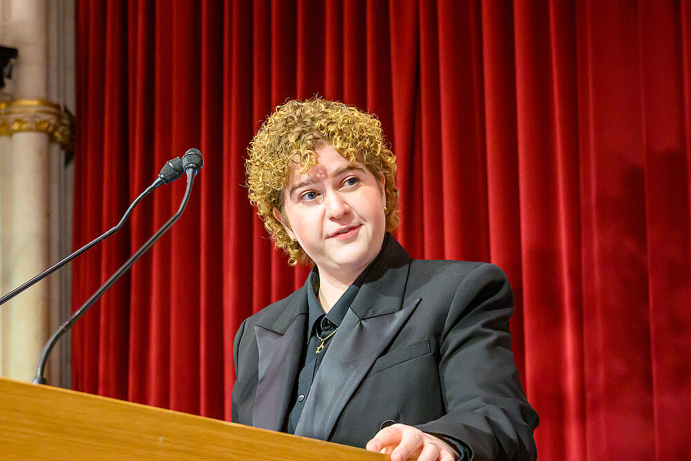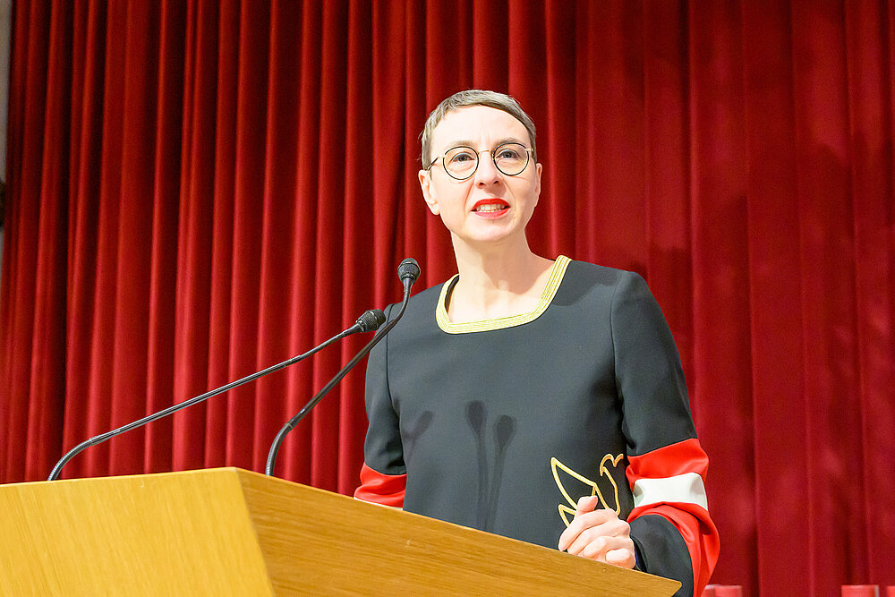Bevor der offizielle Teil der Feier wie gewohnt mit der Österreichischen Bundeshymne sowie der Europahymne abgeschlossen wurde, richtete die Vorsitzende der Studierendenvertretung Iulia Moldovan, BA das Wort an die erfolgreichen Studienabgänger*innen und wünschte allen einen großartigen Start in den neuen Lebensabschnitt.