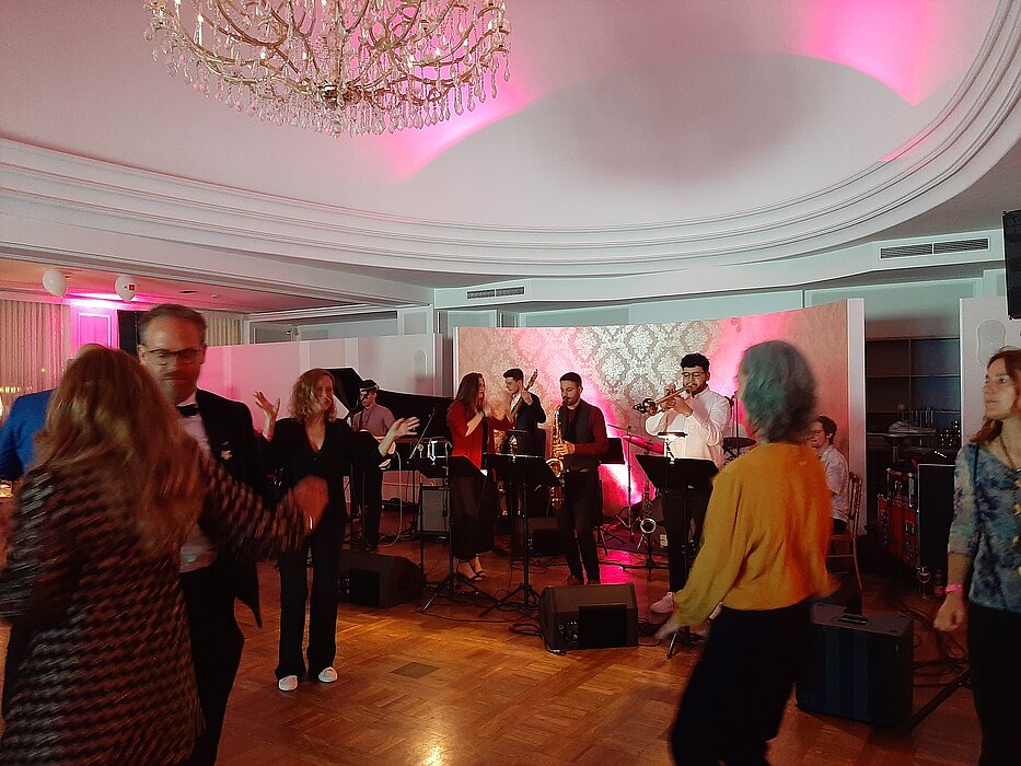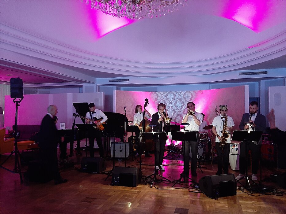 Für gute Stimmung im Lehar Saal des Kursalons Wien haben auch drei Ensembles aus dem Studiengang Jazz gesorgt. Den Anfang machte das Traditional Jazz Ensemble, das das Publikum mit bekannten Klassikern in die Goldenen 1920er und 30er Jahre mitgenommen hat. Auch dem wohl berühmtesten Modetanz aus dieser Zeit, dem Charleston, wurde umfassend Tribut gezollt. Anschließend war das Funk & Soul Ensemble mit Hits von Soul-Ikonen und aus der Motown-Ära zu hören. Das mitreißende Finale gestaltete das Fusion Ensemble.