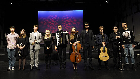 Die Instrumentalist*innen Diane Fadinger (Trompete), Anna Maria Niemiec (Violoncello), Alessandro Traina (Gitarre), Bogdan Laketic (Akkordeon), Oliver Uszynski (Klarinette) und Daniel Miguel Tena Cortell (Bassklarinette) brachten die Neukompositionen der MUK-Studierenden Lang Chen, Ehsan E. Shanjani, Alessandro Traina, Tugba Uçar, Oliver Uszynski und Kejia Xing auf die Bühne.