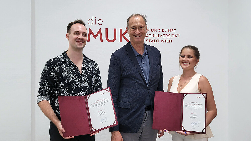 Viktor Aksentijevic, der aktuell bei Linda Watson sein Bachelorstudium absolviert, darf sich über den Ersten Preis und somit über ein Stipendium in der Höhe von € 500,— pro Monat freuen. Der Zweite Preis, ein Stipendium in der Höhe von € 300,— pro Monat, geht an Violetta Vasileva, die im Master Sologesang bei Michail Lanskoi studiert. Beide Stipendien beginnen mit 1. September 2023 und haben eine Laufzeit von 12 Monaten.