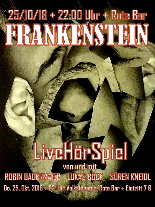 Am 25. Oktober präsentiert MUK-Absolvent Sören Kneidl eine Live-Hörspiel-Variante des vor 200 Jahren erschienenen Horror-Meisterwerks Frankenstein von Mary Shelley. Das Hörspiel ist in Eigenarbeit für die Abschlusspräsentation an der Musik und Kunst Privatuniversität der Stadt Wien in der Sparte Schauspiel entstanden und ist das Ergebnis der Zusammenarbeit mit den beiden ehemaligen Jazz-Studenten Lukas Böck (Schlagzeug) und Robin Gadermeir (Jazz-Bass).