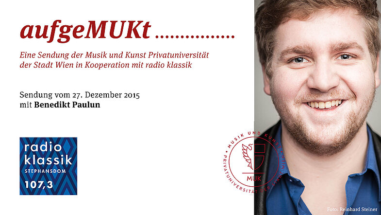 In der zweiten Ausgabe von aufgeMUKt! hören Sie ein Interview mit Schauspielstudent Benedikt Paulun und Dekanin und Studiengangsleiterin Schauspiel Karoline Exner. Paulun wurde im November 2015 als bester Nachwuchsdarsteller mit dem Nestroy-Preis ausgezeichnet und probt gerade für die Premiere von Peter Handkes Die Unschuldigen, ich und die Unbekannte am Rand der Landstraße im Burgtheater (Regie: Claus Peymann).