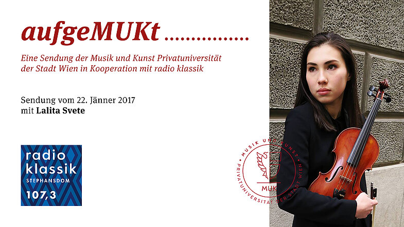 Im Fokus der 12. Folge von aufgeMUKt steht diesmal der Studiengang Saiteinstrumente. Zu Gast bei Marion Eigl sind die Violinistin Lidia Baich, eine der vielseitigsten Geigen-Solistinnen der jungen Klassik-Generation, Absolventin und nun auch Lehrende an der MUK und ihre slowenischn Studentin Lalita Svete. Marion Eigl spricht mit den beiden Violinistinnen über "Lernen durch Lehren", Internationalität im Studium und Virtuosität am Instrument.