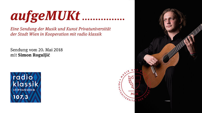In der Mai-Ausgabe von aufgeMUKt! mit Moderatorin Marion Eigl dreht sich alles um das Gitarrenstudium. Seit 2014 studiert Simon Roguljić an der an der Musik und Kunst Privatuniversität der Stadt Wien bei Jorgos Panetsos klassische Gitarre. Es geht ihm beim Spielen um Energie – egal in welcher Epoche, ob solo oder im Ensemble. Derzeit bereitet er sich auf seine Bachelorprüfung an der MUK und zwei Wettbewerbe („Johann Kaspar Mertz“ in Bratislava und „Forum Gitarre Wien“) vor.