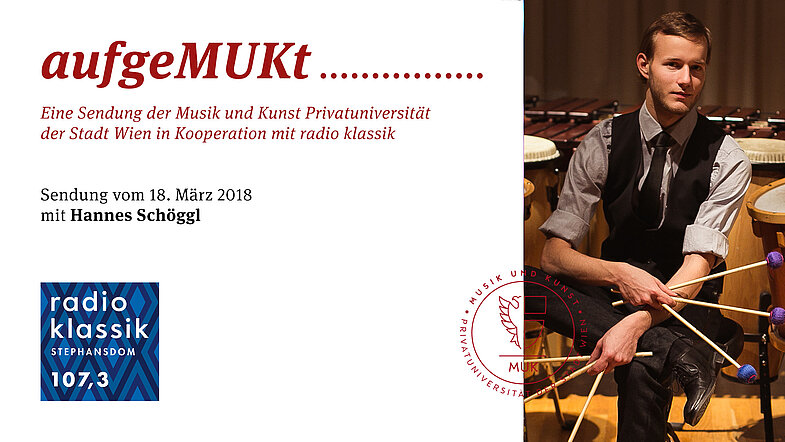 Zu Gast in der 25. Sendung von aufgeMUKt bei Marion Eigl sind dieses Mal Hannes Schöggl und sein Professor Nebojša Jovan Živkovic. Das Thema: Schlagwerk an der MUK. Besonderes Highlight ist eine Bodypercussion-Vorführung von Hannes Schöggl, live aufgenommen während des Interviews.