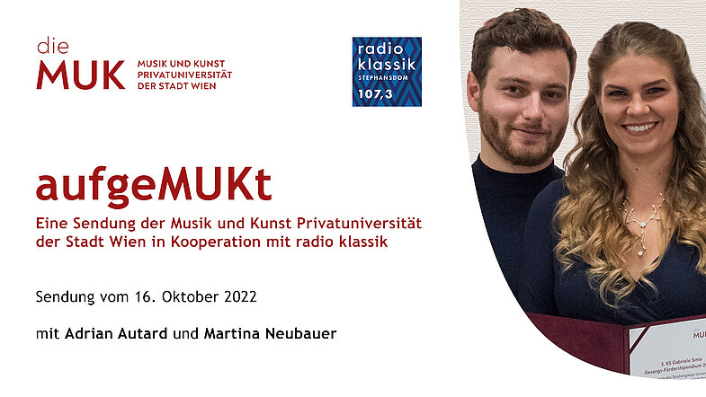 Zu Gast in der Sendung sind Adrian Autard und Martina Neubauer, beide absolvieren derzeit ihr Studium Sologesang an der MUK. Im Vorsingen zum KS Gabriele Sima Gesangsstipendium haben die beiden Künstler*innen überzeugt und freuen sich über ein einjähriges Stipendium freuen. Marion Eigl stellt die beiden Talente vor.