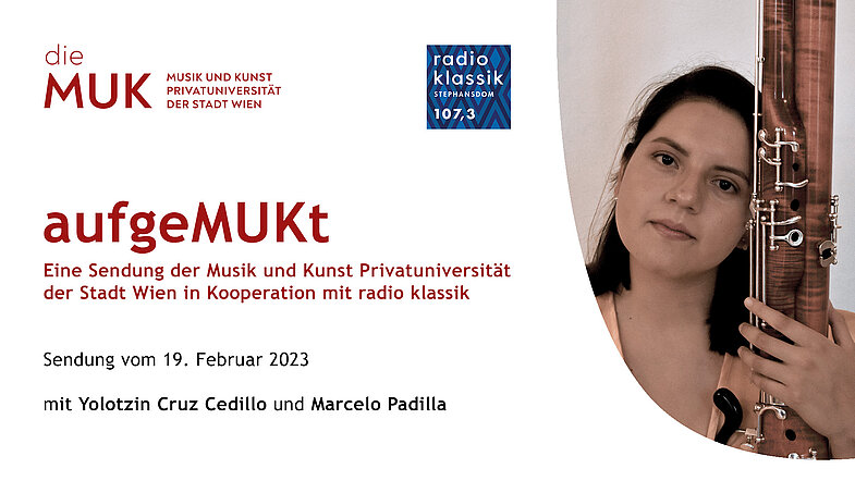 In der neuesten Ausgabe von aufgeMUKt! erzählen die beiden Fagottist*innen Yolotzin Cruz Cedillo und Marcelo Padilla wie es ist bereits in jungen Jahren seine Heimat fürs Studium zu verlassen. Padilla unterrichtet seit 2011 an der MUK, Cruz Cedillo hat bei ihm ihr Bachelor- und Masterstudium absolviert.