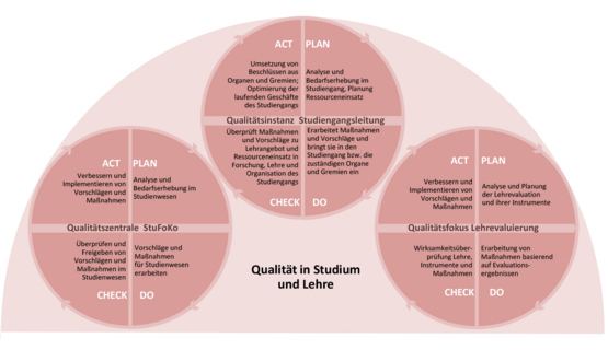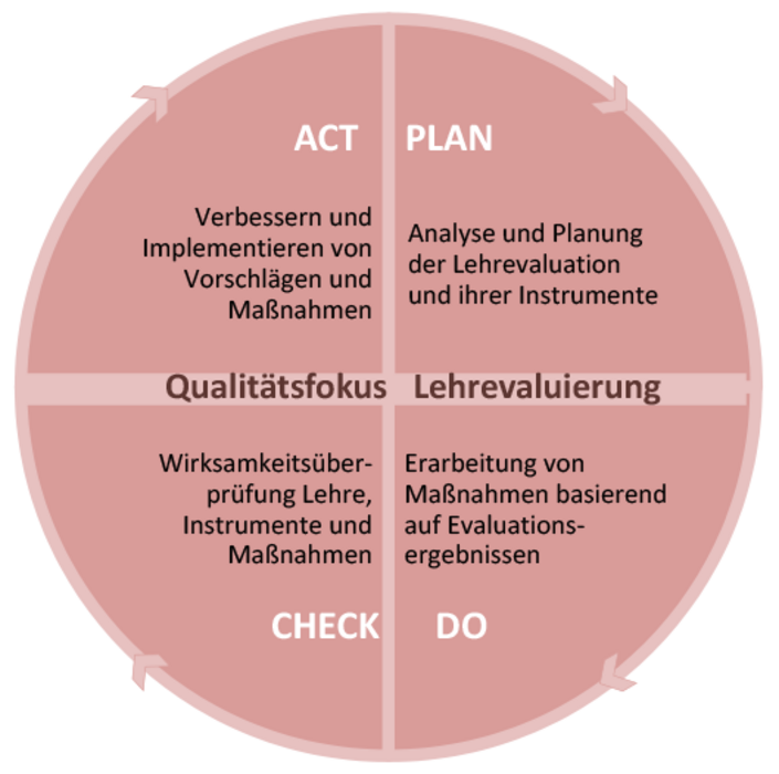 Teaching evaluation is composed of several instruments and leads to quality development at different university levels. Findings from teaching evaluation are incorporated into the individual departments, the faculties and the university bodies and committees.