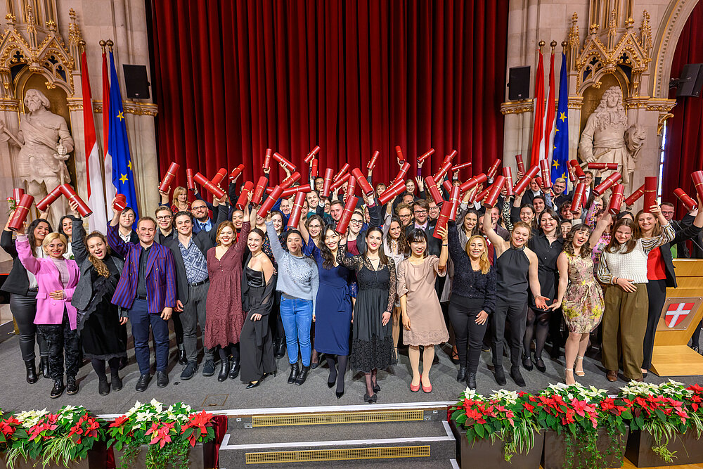 Um den Studienabschluss gebührend zu feiern, werden heuer wieder den Bachelor und Master of Arts die Urkunden der akademischen Grade im exklusiven Rahmen überreicht. Im Festsaal des Wiener Rathauses gratulieren Vertreter*innen der MUK und der Stadt Wien zum erfolgreichen Abschluss einer qualifizierten und international renommierten Ausbildung. Ein künstlerisches Rahmenprogramm verleiht der Feier ihren außergewöhnlich festlichen Charakter. Um diesem besonderen Anlass gerecht zu werden, können sich die diesjährigen Absolvent*innen anschließend von Familie, Freund*innen und Lehrenden feiern lassen.