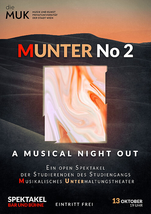 Open Mic, Open Stage Open Spektakel! Die Studierenden des Studiengangs Musikalisches Unterhaltungstheater (MUNTER) präsentieren ein selbst kuratiertes Musicalprogramm als Open Spektakel und eben dort. Mit ihrem selbst gestalteten Abend entführen sie uns in ihre Welt voller fesselnder Geschichten und großer Emotionen — gefüllt mit Leidenschaft und ihrem Herzblut. Unter ihrem Motto „Kreativität kennt keine Grenzen!“ laden sie zu einer Musical Night Out!