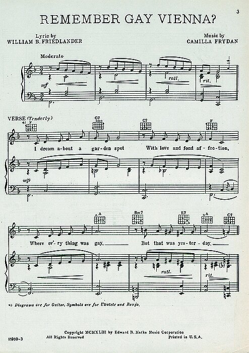 Remember Gay Vienna — mit diesem Song träumte die Komponistin Camilla Frydan im New Yorker Exil von ihrer Heimat. Geboren wurde sie 1887 in Wiener Neustadt als Tochter des Bankangestellten Heinrich Herzl. Ihr Bruder Ludwig wurde Arzt, jedoch berühmt vor allem für seine unter dem Pseudonym Herzer verfassten Operettenlibretti für Franz Lehár, Robert Stolz u. a. Camilla, zunächst pianistisches Wunderkind, wurde 1907 mit 20 Jahren als Soubrette am Raimundtheater und als Diseuse am legendären Cabaret Fledermaus (Ecke Johannesgasse/Kärntnerstraße) engagiert. Dort lernte sie im Umkreis der Literaten Alfred Polgar und Egon Friedell auch dessen Bruder Oskar Friedmann kennen, der ihr Gatte, Librettist und auch Verleger wurde. In dieser Zeit begann sie unter dem Pseudonym Frydan eine beachtliche Karriere als Komponistin und auch Dirigentin ihrer Werke.