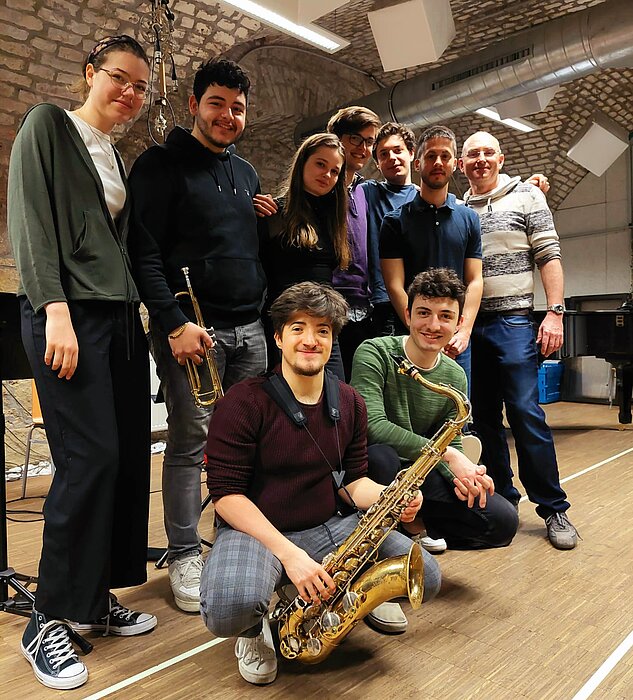 Eneo Gjoka, Tenor Saxophon/Klarinette; Raphael Greil, Trompete; Matyas Papp, Posaune; Miodrag Malesevic, Gitarre; Emin Musaiev, Klavier; Jakob Lang, Bass; Jakob Zallinger, Schlagzeug; Elena Victoria Schäfer, Gesang