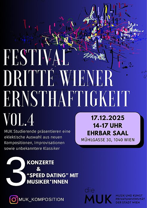 Das Festival Dritte Wiener Ernsthaftigkeit, das sich kritisch hinterfragend in die grandiose Wiener Tradition der Komposition von Wiener Klassik über die dodekaphonische zweite Wiener Schule einreiht, findet wegen des großen Erfolgs bereits zum vierten Mal statt — heuer im Ehrbar Saal.