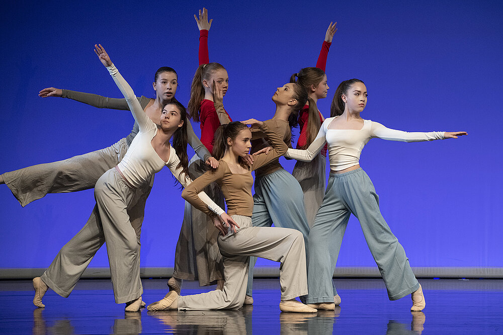 Die Lehrenden des Vorbereitungslehrgangs Tanz — Margit Legler, Lucian Necsea, Nora Schnabl-Andritsch, Jolantha Seyfried, Nina Swoboda, Vera-Viktoria Szirmay, Audrey Van Herck und Sebastian Schmidt (als Gast) —entwickeln gemeinsam mit den jungen Tänzer*innen die Stücke von MUK/tanzt/juniors.