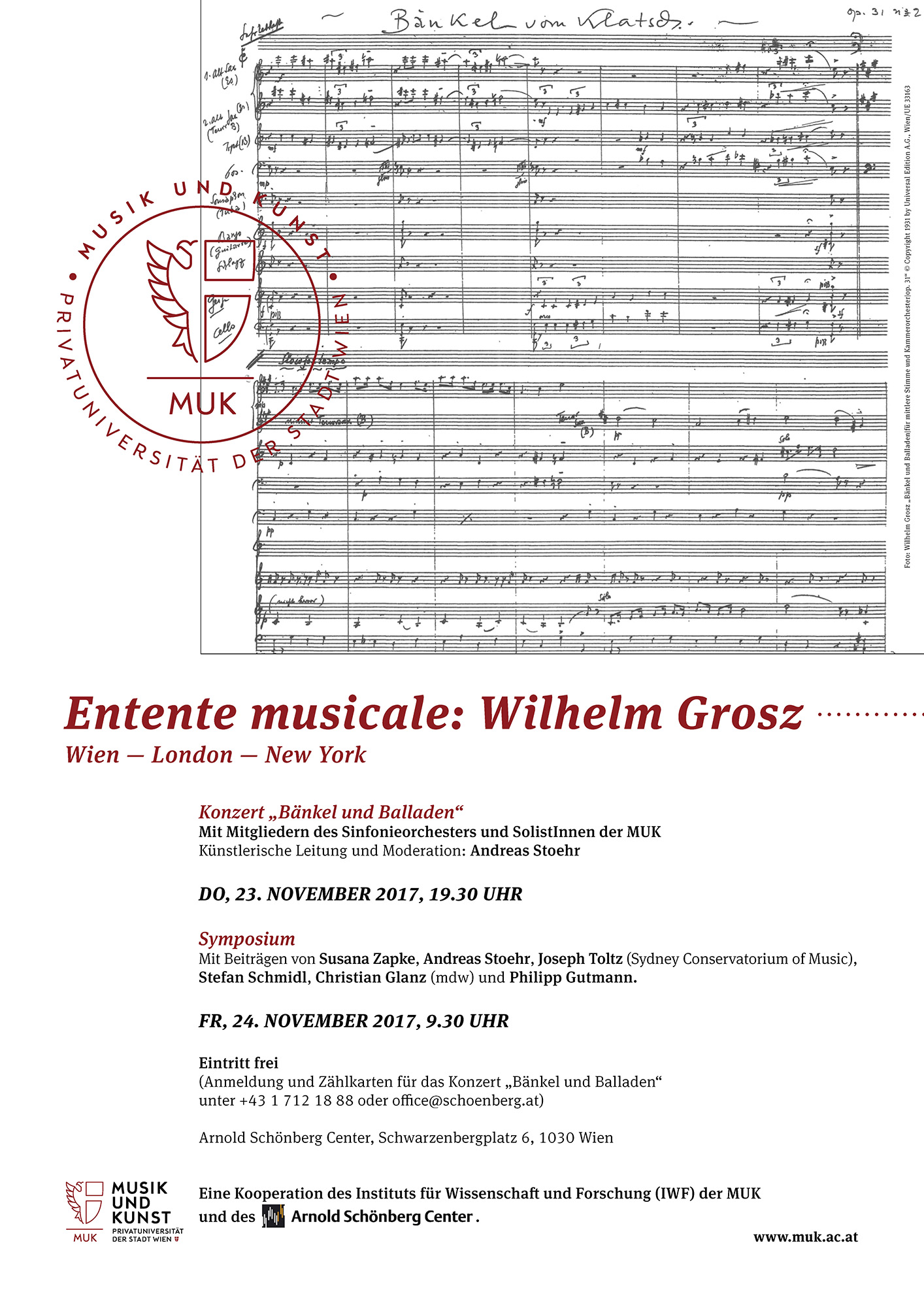 Das Schaffen von Wilhelm Grosz, der 1933 in die Emigration gezwungen und dessen Musik 1938 als »entartet« deklariert wurde, fand bis heute wenig Verbreitung. Als Schüler Franz Schrekers geriet er zwar nicht in unmittelbaren Kontakt mit der Lehre Schönbergs, gehörte jedoch einem intellektuellen Kreis von Wiener Komponisten der 1920er und 1930er Jahre an, dessen Geschichte und Rezeption noch weitgehend unbearbeitet blieb. Die kulturhistorische Zuordnung seines stilistisch breitgefächerten Œuvres, das von Liedern, Opern und Orchesterwerken bis zur Filmmusik reicht, ist Gegenstand dieser ersten Wilhelm Grosz gewidmeten wissenschaftlichen Tagung. Unter dem Titel Bänkel und Balladen präsentieren Studierende der MUK in einem Gesprächskonzert Werke von Arnold Schönberg, Wilhelm Grosz und Hanns Eisler. Diese drei Komponisten, deren Lebensläufe in Wien ihren Anfang nahmen und schließlich in der Emigration mündeten, haben sich auf unterschiedliche Weise mit den Genres Lied und Ballade auseinandergesetzt.