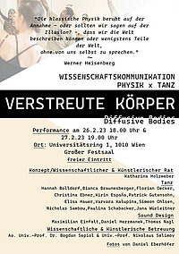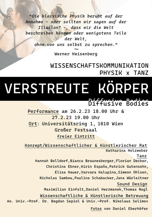 Katharina Holzweber, Tänzerin und Physikerin, hat zu diesem Zweck 7 Tänzer*innen und 5 Tanz-Studierende der Musik und Kunstuniversität der Stadt Wien (MUK) im Wintersemester 2022/23 auf ihrem Weg ein abendfüllendes Tanzstück auf Basis physikalischer Konzepte und Anschauungen zu kreieren, choreografisch und wissenschaftlich begleitet.