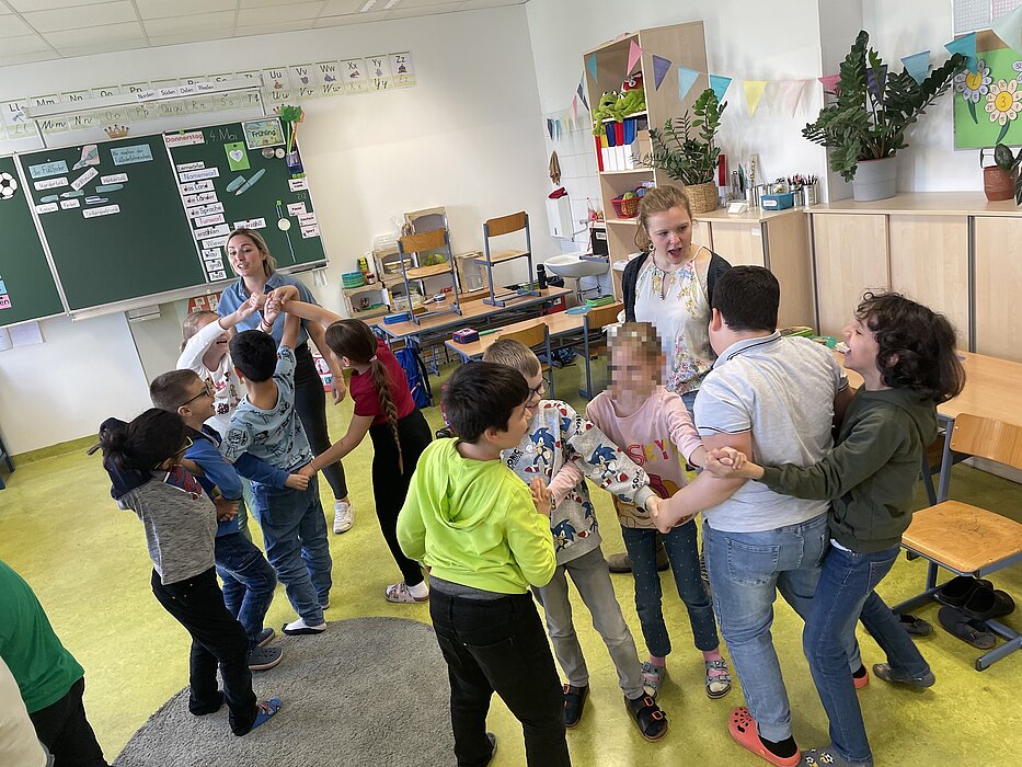 2: Darüber hinaus wurde eine Experimental-Studie mit den Klassen konzipiert und durchgeführt. Die 50-minütige, spielerische Unterrichtseinheit wurde durch zwei Student*innen in möglichst identischer Form in beiden Klassen durchgeführt. Mittels verschiedener Übungen sollte hierbei das Sozialverhalten und das Klassengefüge zwischen den Schüler*innen untersucht werden. Gibt es Unterschiede in der Teamfähigkeit? Wie gehen die Schüler*innen miteinander um? Wie geduldig und unterstützend sind sie mit ihren Mitschüler*innen? Die Spiele reichten dabei von Teamaufgaben für die ganze Gruppe, über Kreativitätsübungen in Zweiergruppen bis hin zu Bewegungsspielen. Eine Studierendengruppe hatte dabei die Aufgabe, diese Vorgänge zu beobachten sowie zur Analyse im Nachhinein auf Video zu dokumentieren.